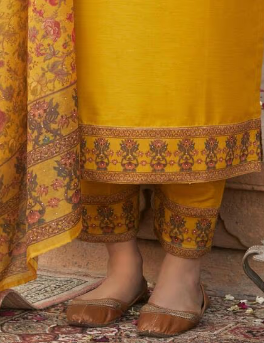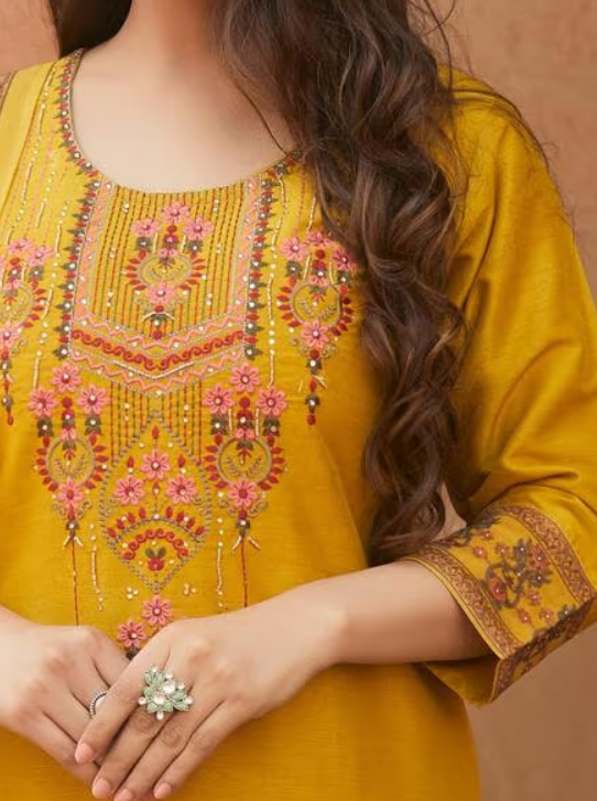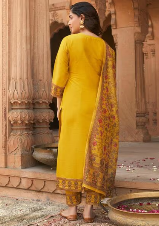 Give your collection of casuals an update with this suit set from our latest collection. The set includes a straight-fit linen silk kurta with computerized thread and hand embroidery, regular pants, and a digital printed chanderi silk dupatta.