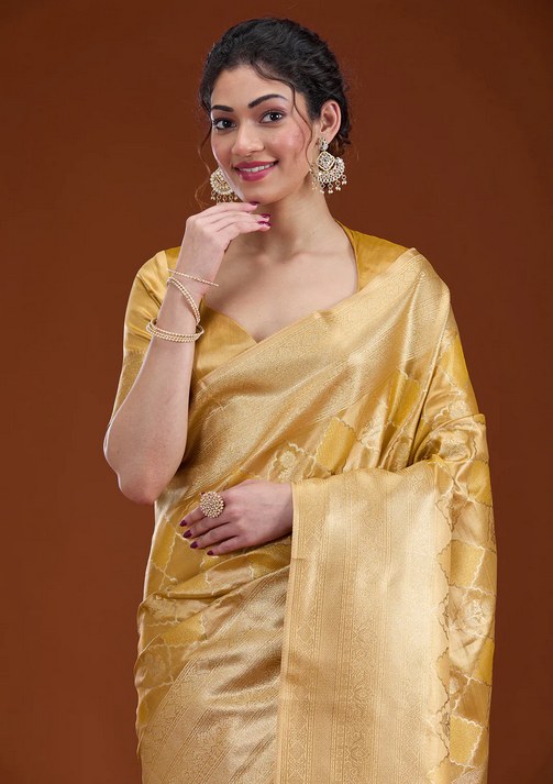 Illuminate any gathering with this Banarasi saree, adorned with golden zari work. A symbol of classic beauty and sophistication.